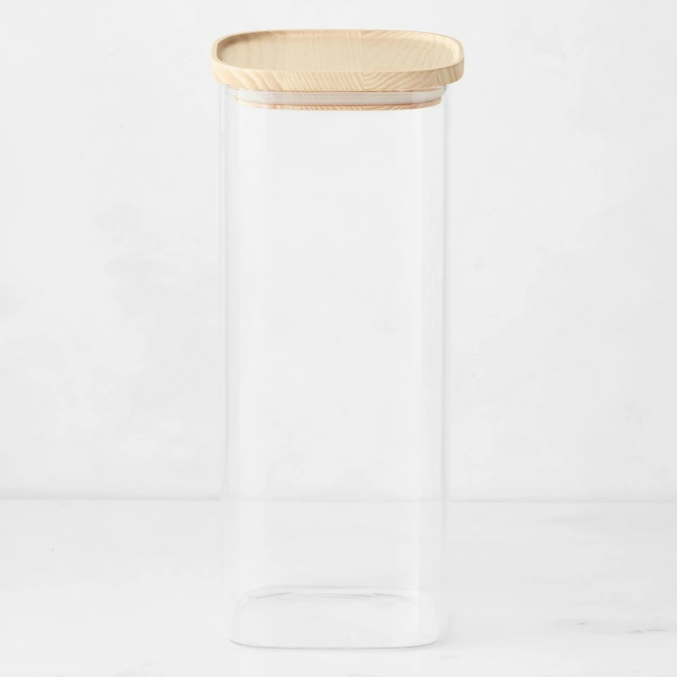 Organise the kitchen in style. Handcrafted of durable borosilicate glass with richly grained ash wood lids, our canisters offer attractive storage and easy visibility for coffee, sugar, pasta, rice and other dry goods. The lids feature airtight silicone gaskets to keep contents fresh. The graduated sizes stack for space-saving storage.