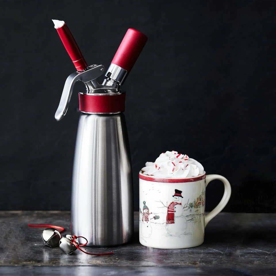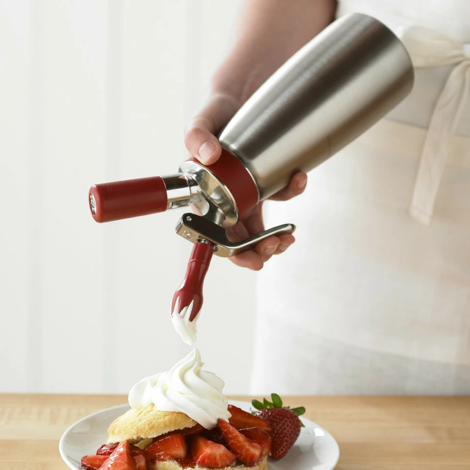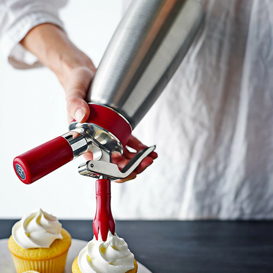 Dispense whip cream, soft cheeses and buttercream frostings in seconds with this powerful tool. Three different dispenser nozzles let you add a decorative flourish for garnishes, cake toppings and festive borders.