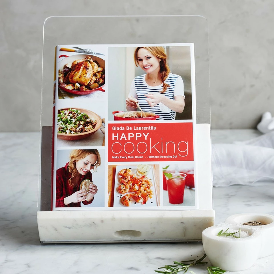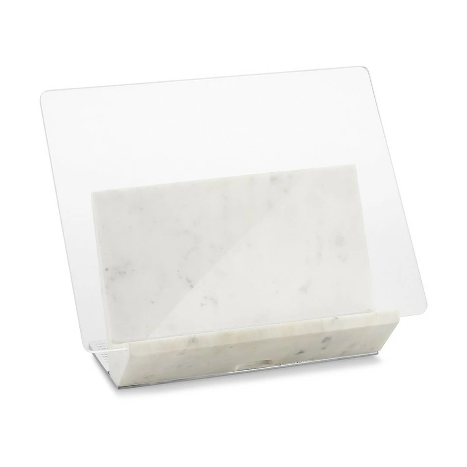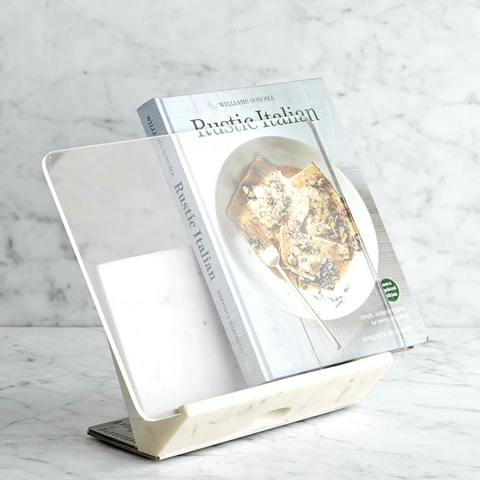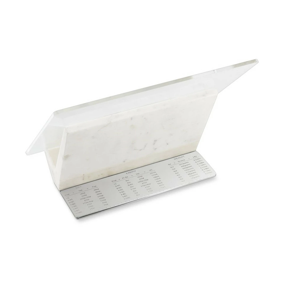 Our customers have been asking us for years to create a cookbook holder for the kitchen that will take pride of place. This stunning design is our response – handcrafted of white marble on a stainless-steel base. The acrylic shield protects cookbooks, while a convenient magnetic back plate slides off to display US and metric equivalent measures for cooking.