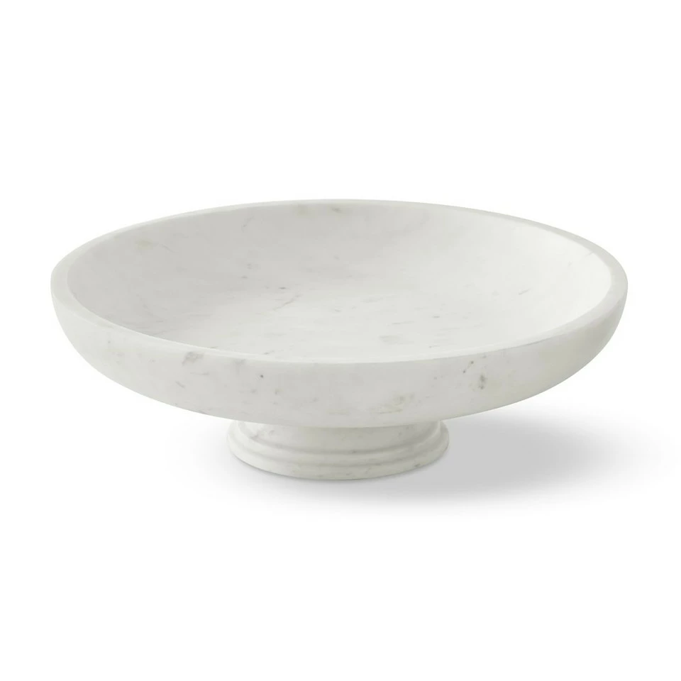 This solid marble pedestal bowl gives elegant presentation to whole fruits, showcasing their colours against the cool white stone. Subtle pale grae markings, intrinsic to the marble, imbue it with depth and dimension, bringing timeless style to table settings, sideboards or countertop display.