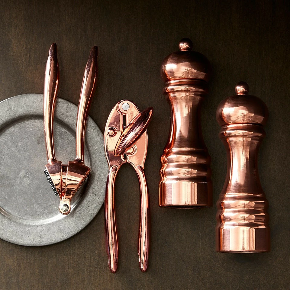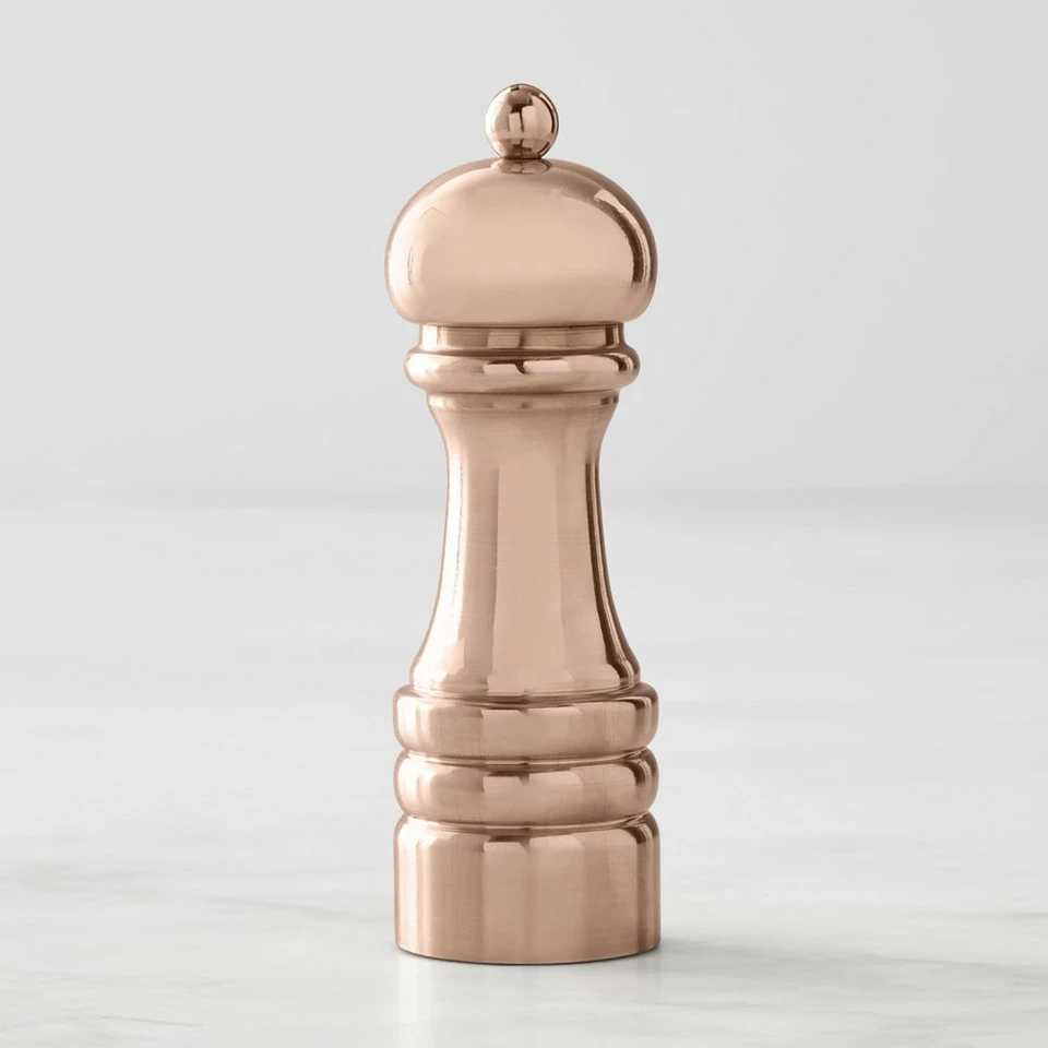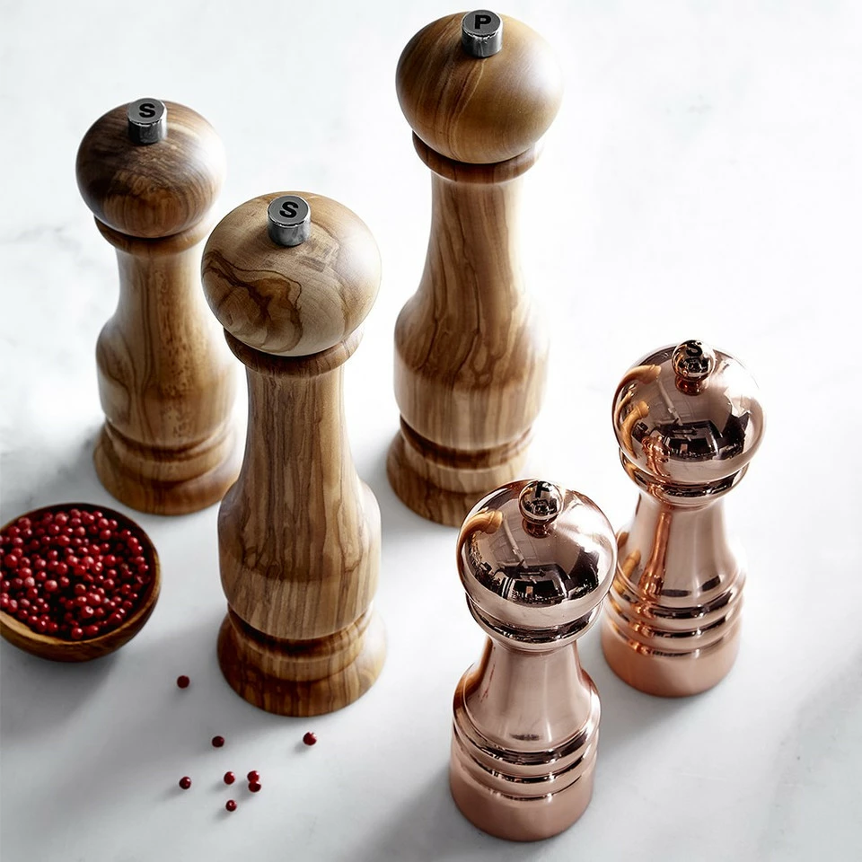 Designed in-house, our salt and pepper mills are crafted exclusively for Williams Sonoma in a workshop in northern Italy that specialises in turned-wood products. Artisans employ traditional woodworking techniques to create this classic silhouette, which is finished with lustrous copper plating for exceptional colour and shine.