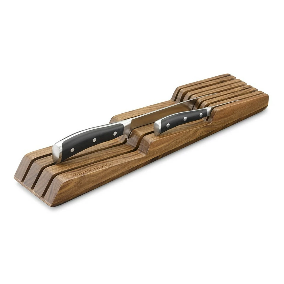 Keep your favorite kitchen knives organized and protected by storing them in our solid-wood drawer rack. Designed to sit flat inside a kitchen drawer, the rack safely holds 7 knives in a compact arrangement, freeing up space on your countertop.