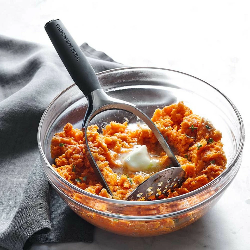 Our potato masher has a curved head to enable an efficient rocking motion for mashing. Evenly sized holes create a uniform texture, and you can use the head as a handy scoop after mashing. A soft-grip handle makes this tool comfortable to use when applying downward pressure.