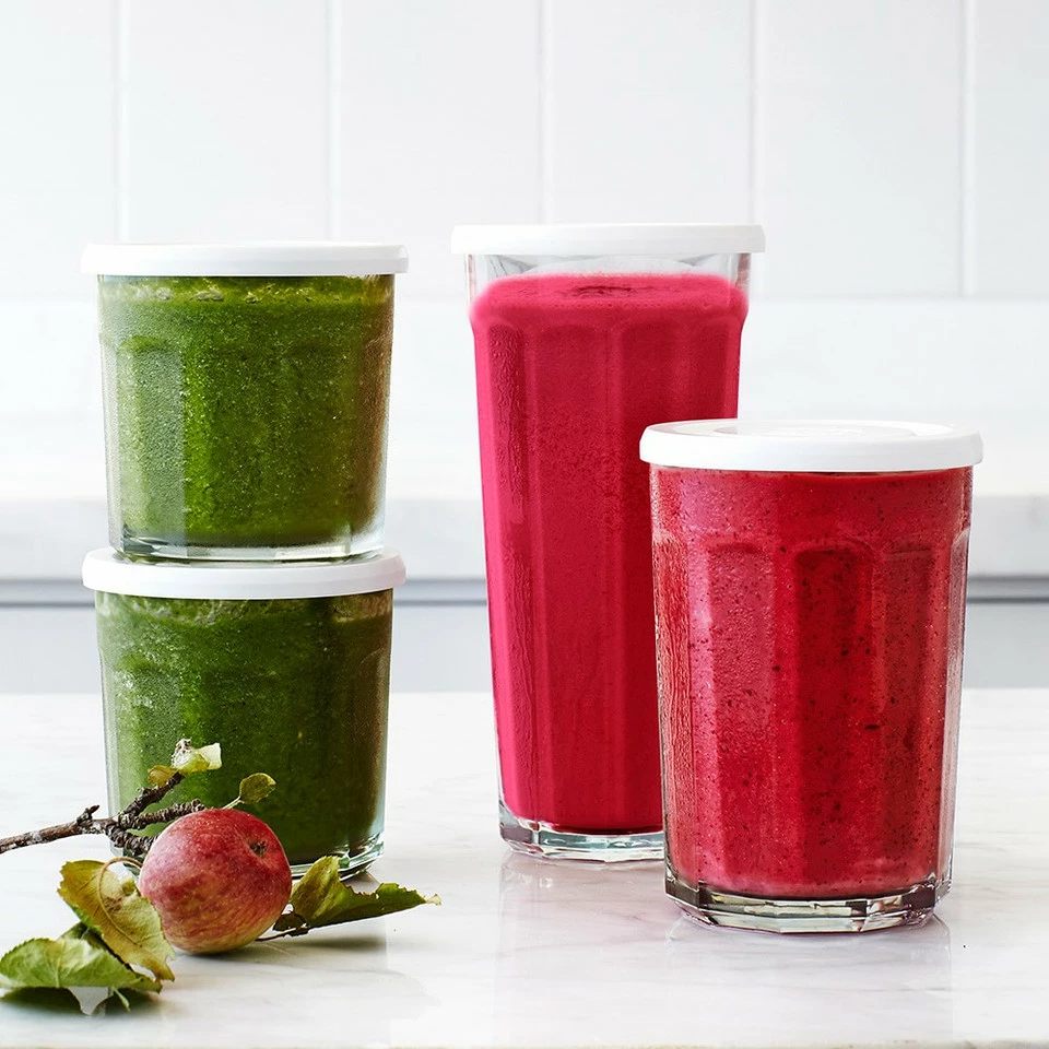 - Includes white plastic lids, ideal for storing drinks in the refrigerator.